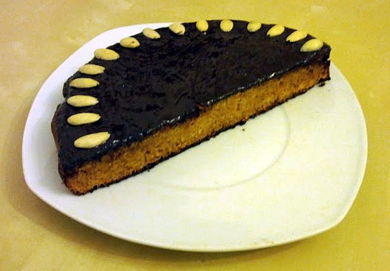 Ciekawe, intensywnie pomarańczowe ciasto z polewą czekoladową i migdałami. W sam raz na Święta :) Moim zdaniem, ciasto jest najlepsze z polewą z gorzkiej czekolady. Uwaga: bardzo ważnym jest, by usunąć jak najwięcej białego albeda ze skórki pomarańczy, ponieważ nadaje ono wypiekowi nieprzyjemny, gorzki smak!